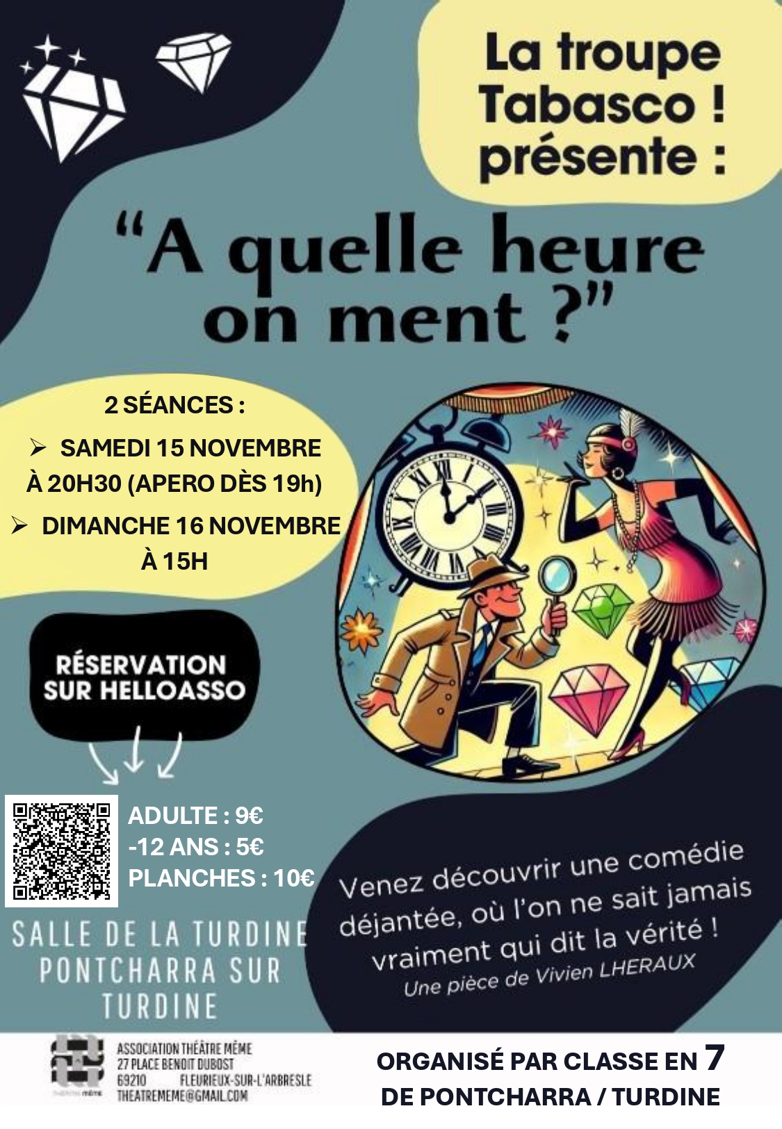 novembre, 2025 A quelle heure on ment ? 16nov15 h 00 minA quelle heure on ment ? Horaire (Dimanche) 15 h 00 min LieuSalle de la Turdine – Pontcharra-sur-Turdine Organisé par Classes en 7 CalendrierAgenda