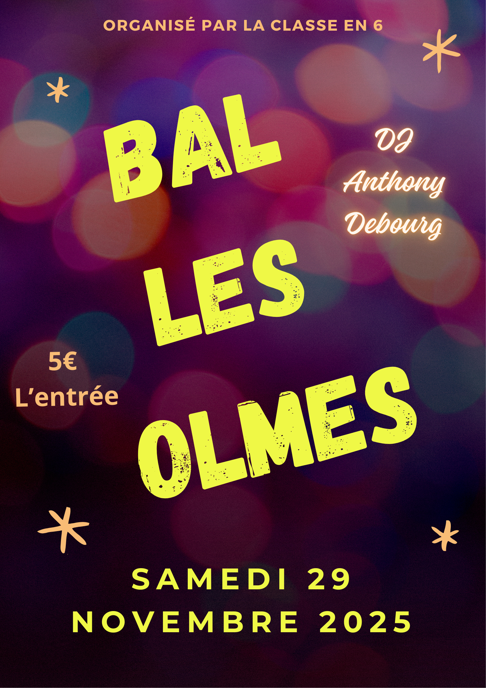 novembre, 2025 Bal 29nov22 h 00 minBal Horaire (Samedi) 22 h 00 min LieuSalle des fêtes - Les Olmes Organisé par Classes en 6 CalendrierAgenda
