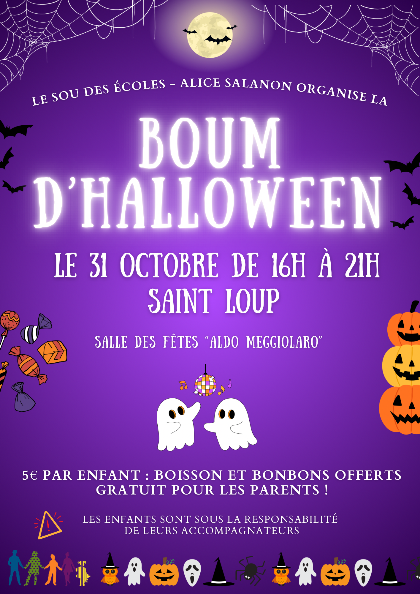 octobre, 2025 Boum d'Halloween 31oct16 h 00 min21 h 00 minBoum d'Halloween Horaire (Vendredi) 16 h 00 min - 21 h 00 min LieuSalle Meggiolaro - Saint-Loup Organisé par Sou des écoles CalendrierAgenda