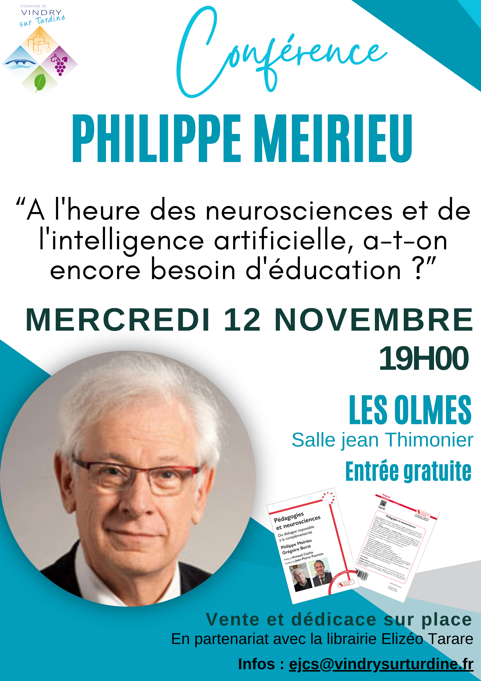 novembre, 2025 Conférence Philippe Meirieu 12nov19 h 00 minConférence Philippe Meirieu Horaire (Mercredi) 19 h 00 min LieuSalle des fêtes - Les Olmes Organisé par Commune de Vindry-sur-TurdineCommune de Vindry-sur-Turdine CalendrierAgenda