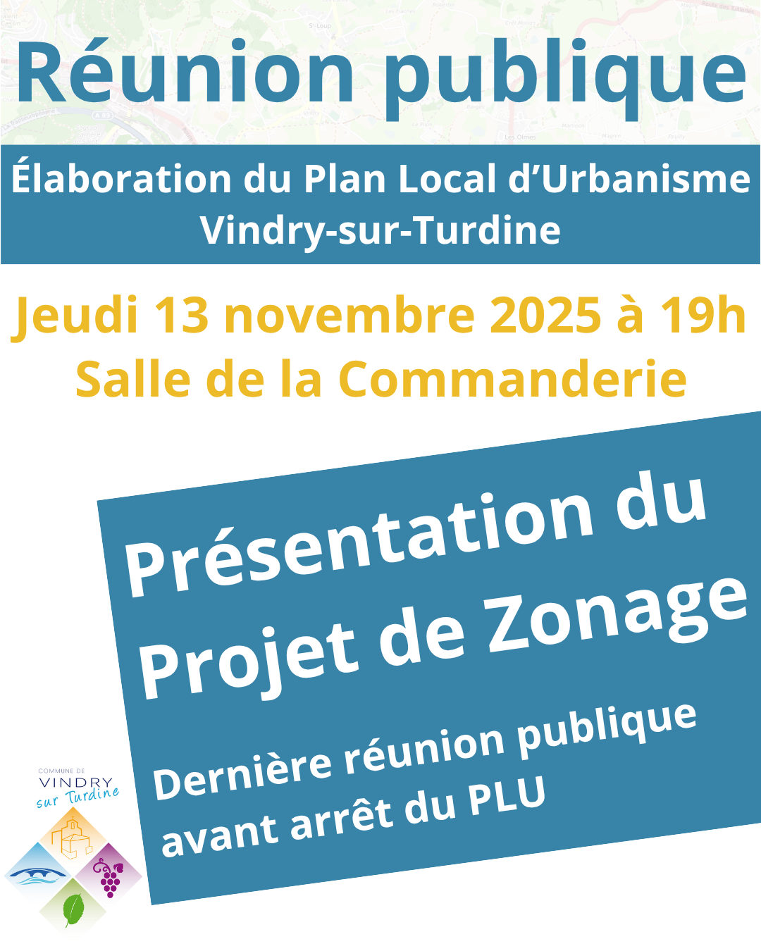📢 [Réunion publique - Plan Local d’Urbanisme] 🏡 La commune de Vindry-sur-Turdine poursuit l’élaboration de son Plan Local d’Urbanisme (PLU) et vous invite à une réunion publique : 📅 Jeudi 13 novembre