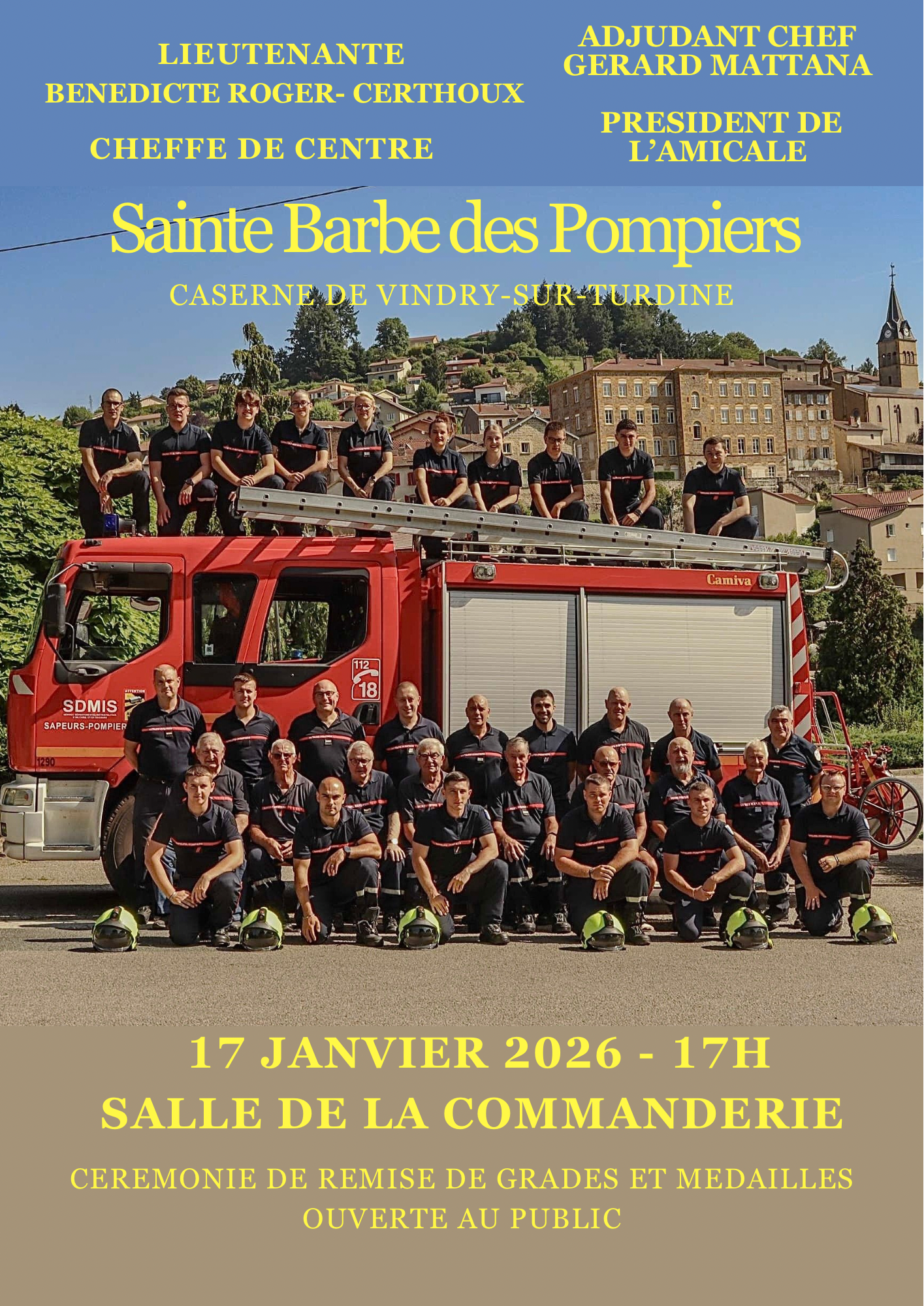 janvier, 2026 Sainte Barbe Salle de la Commanderie - Pontcharra-sur-Turdine Rue de la Commanderie, 69490 Vindry-sur-Turdine 17jan17 h 00 minSainte Barbe Horaire (Samedi) 17 h 00 min LieuSalle de la Commanderie - Pontcharra-sur-TurdineRue de la Commanderie, 69490 Vindry-sur-Turdine Organisé par Sapeurs-Pompiers CalendrierAgenda