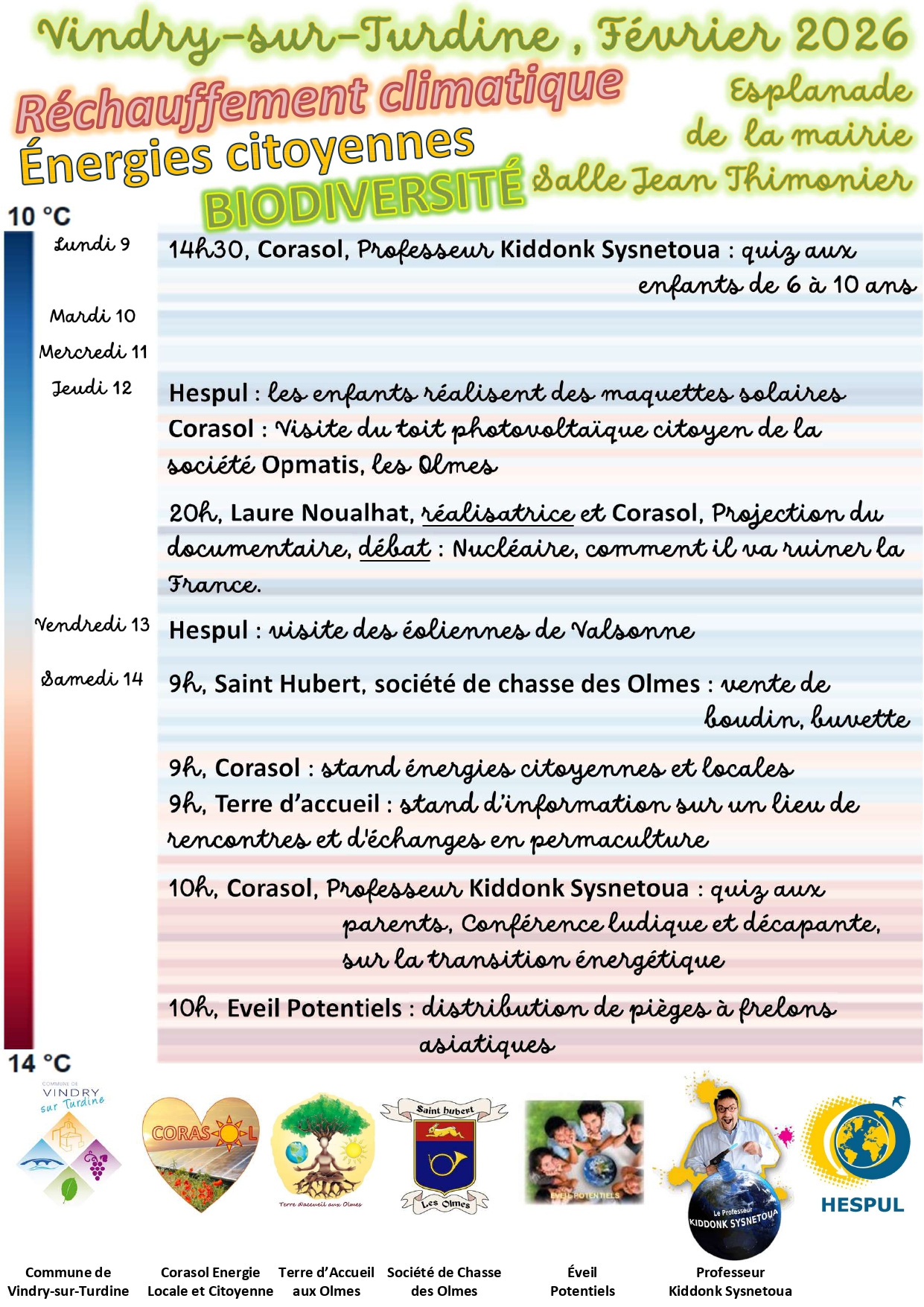 Les associations Corasol, Hespul, Éveil Potentiels, la Société de Chasse, Terre d’Accueil, en partenariat avec la commune de Vindry-sur-Turdine, vous invitent à une semaine de sensibilisation au réchauffement