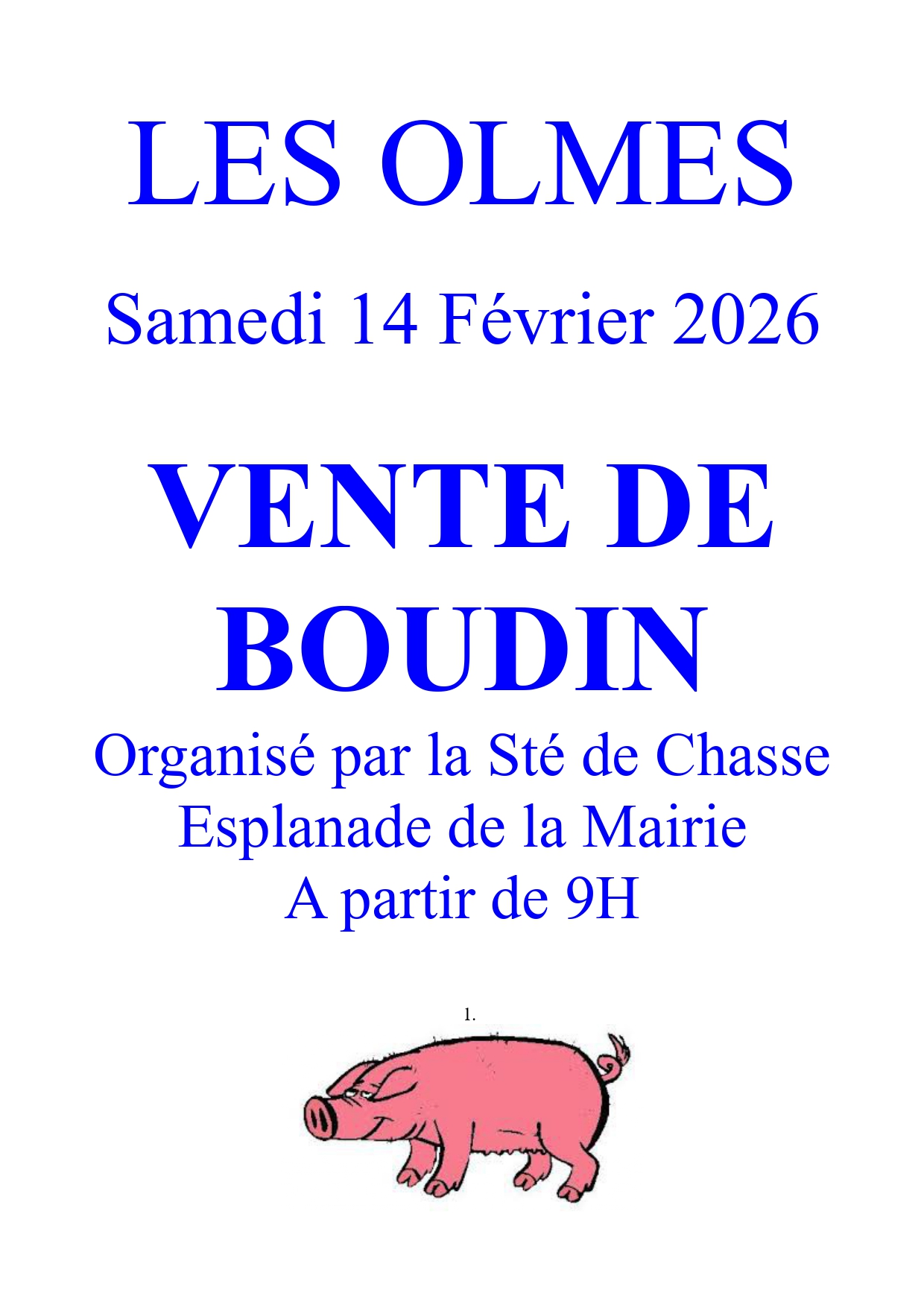 février, 2026 Vente de boudin 14fév9 h 00 minVente de boudin Horaire (Samedi) 9 h 00 min LieuEsplanade - Les Olmes Organisé par Société de Chasse - Les Olmes CalendrierAgenda
