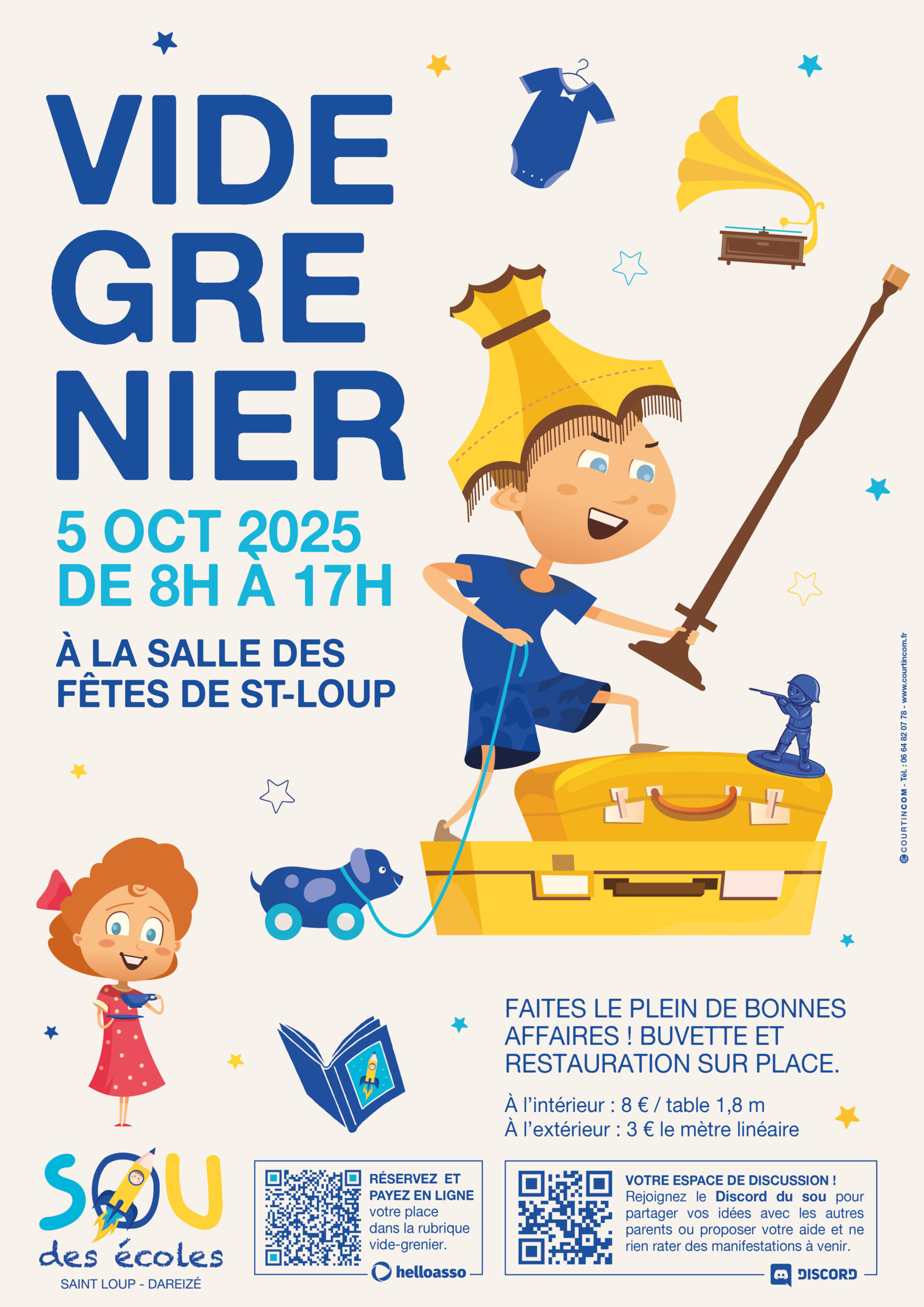 octobre, 2025 Vide Grenier 05oct8 h 00 min17 h 00 minVide Grenier Horaire (Dimanche) 8 h 00 min - 17 h 00 min LieuSalle des fêtes - Saint Loup Organisé par Sou des écoles CalendrierAgenda