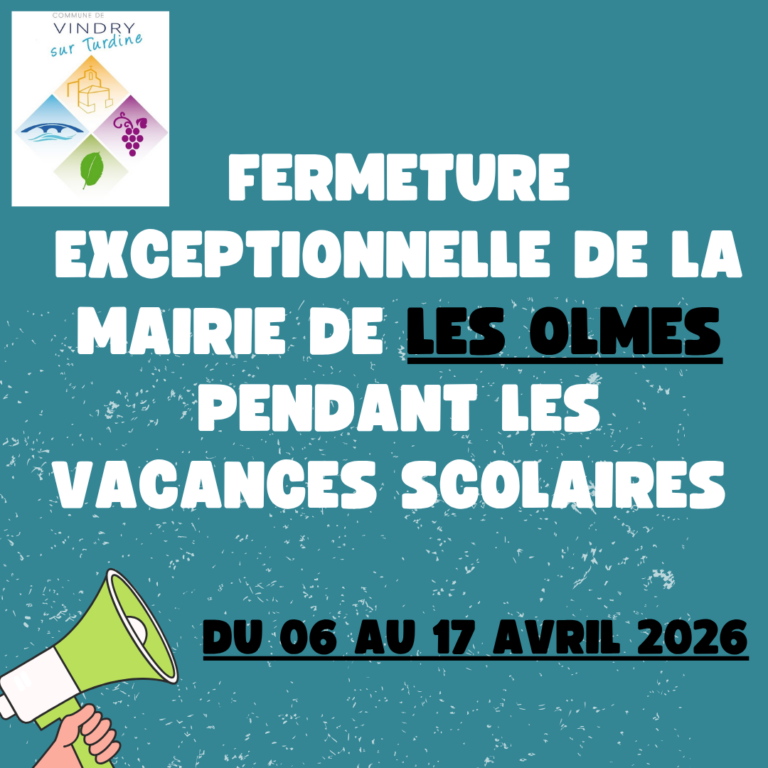 Fermeture exceptionnelle de la mairie de les OlmesPar Vindry-sur-Turdine / 1 avril 2026 La mairie annexe de les Olmes sera exceptionnellement fermée pendant les vacances scolaires