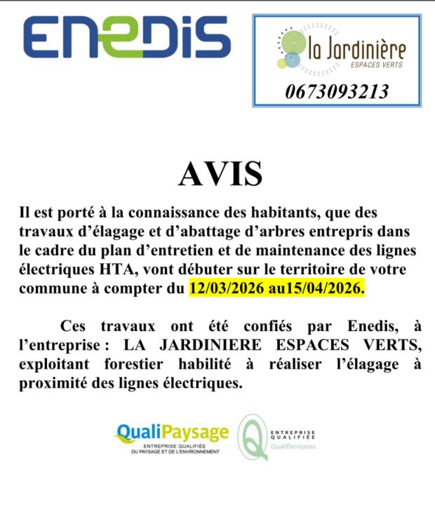 Travaux d’élagage et d’abattage d’arbres entrepris dans le cadre du plan d’entretien et de maintenance des lignes électriques HTA du 12 mars 2026 au 15 avril 2026