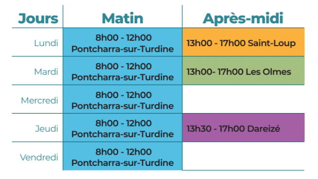 Mairie et services communaux Coordonnées Monsieur le Maire5 Place Jean XXIII 69490 VINDRY SUR TURDINE 04 74 05 61 03 mairie@vindrysurturdine.fr Mairies de Vindry-sur-Turdine - Horaires d'ouverture Une démarche à effectuer, rendez-vous dans la mairie de votre choix : Dareizé Jeudi: 13h30-17h00 Les Olmes Mardi: 13h00-17h00 Saint-Loup Lundi: 13h00-17h00 Pontcharra-sur-Turdine Lundi: 08h00-12h00 Mardi: 08h00-12h00 Mercredi: 09h00-12h00 Jeudi: 08h00-12h00 Vendredi: 08h00-12h00 Les services communaux